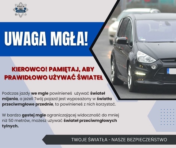Jesienno - zimowa pogoda nie sprzyja kierowcom – częste mgły i opady znacznie ograniczają widoczność, co zwiększa ryzyko niebezpiecznych sytuacji na drodze. Policja apeluje o rozwagę i przypomina, że właściwe używanie świateł oraz dostosowanie prędkości do warunków to podstawowe zasady, które mogą uratować życie.