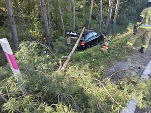 Kierująca Audi A3 zasnęła za kierownicą i uderzyła w sosnę. Na miejscu ucierpiała udzielająca jej pomocy ratowniczka medyczna, na którą spadła gałąź od nadłamanego drzewa