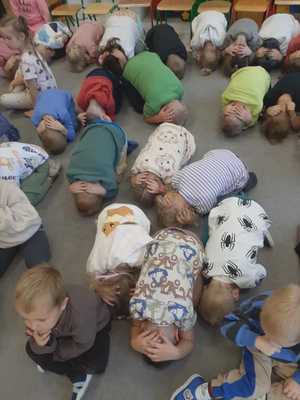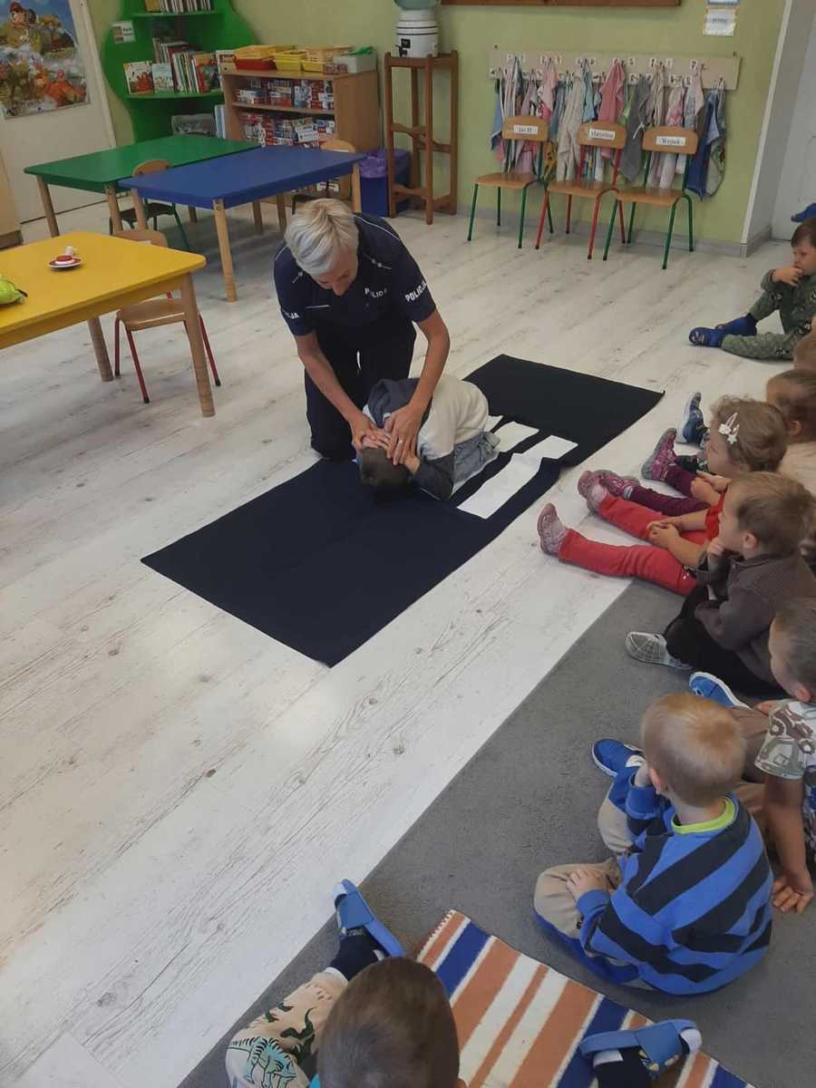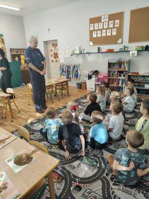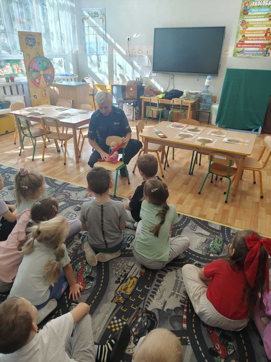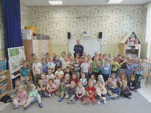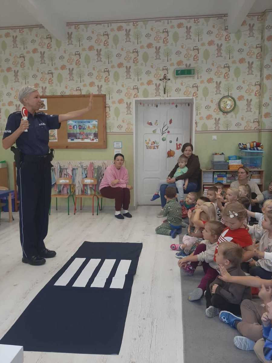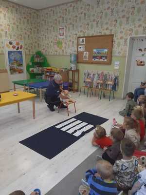 Policjantka z mogileńskiej komendy policji w formie zabawy przekazała dzieciom najważniejsze informacje dotyczące bezpiecznego poruszania się po drodze. Omówiła szczegółowo jak należy zachowywać się w obrębie przejścia dla pieszych oraz dlaczego tak ważne jest stosowanie elementów odblaskowych i jazda samochodem w specjalnych fotelikach. Osobne miejsce poświęciła zagrożeniom ze strony zwierząt oraz w kontakcie z obcymi, których dziecko może spotkać w rożnych miejscach i sytuacjach.