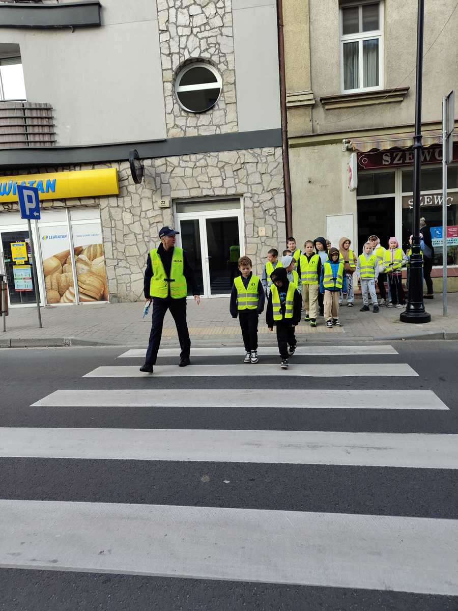 Po krótkiej teorii przyszedł czas na sprawdzenie wiedzy w praktyce. Trzecioklasiści pod czujnym okiem policjantki wyszły na ulicę, gdzie bez większych problemów poradziły sobie z prawidłowym przejściem na druga stronę. Dzieci doskonale wiedziały na jakim świetle należy przechodzić przez jezdnię, którą stroną ulicy należy iść, gdy nie ma chodnika oraz że po zmroku należy obowiązkowo nosić odblaski.