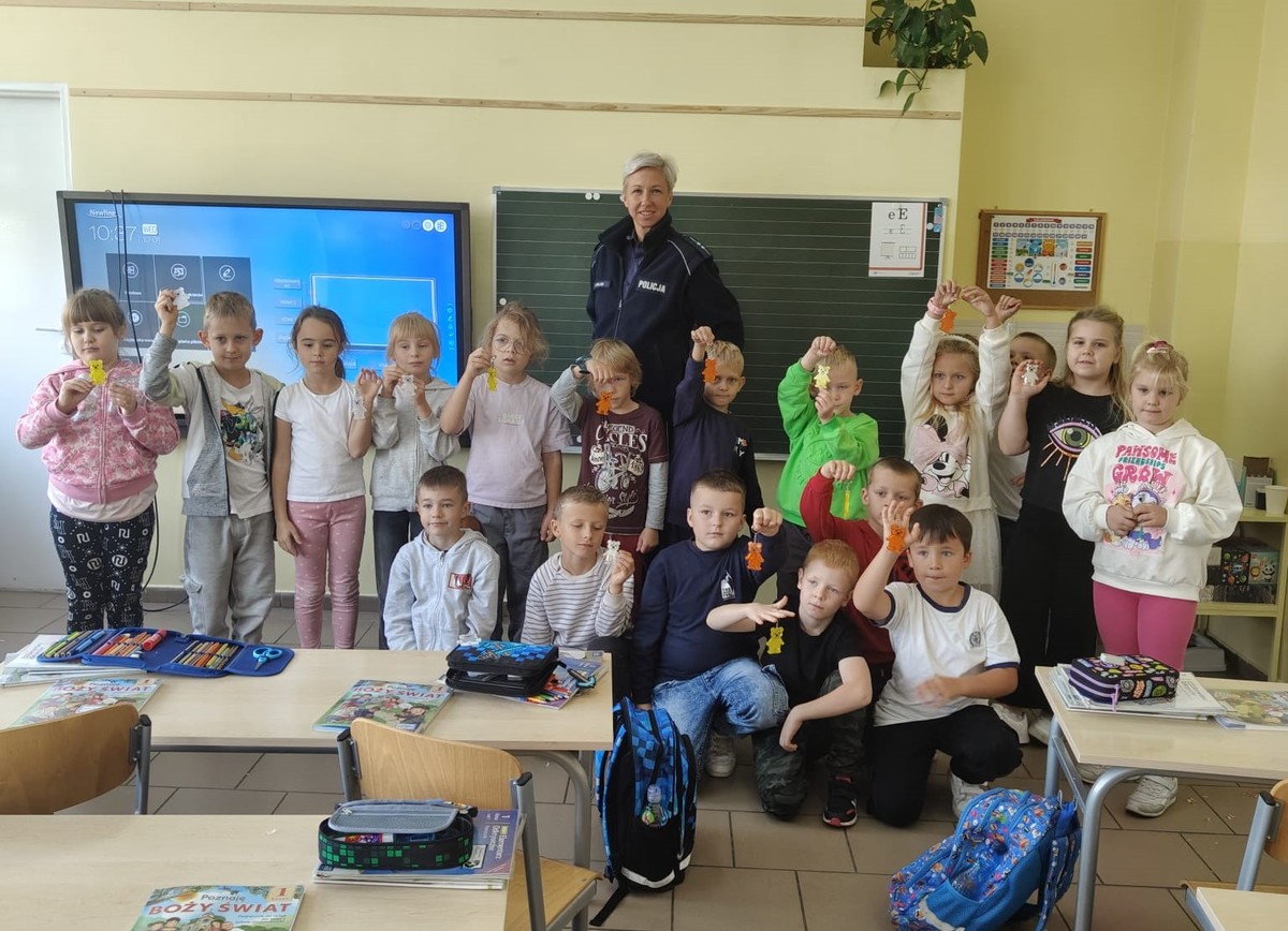 Policjantka prewencji asp. Magdalena Pollak przypomniała uczniom zasady bezpiecznego przechodzenia przez jezdnię, wytłumaczyła dlaczego podczas jazdy samochodem najmłodsi powinni korzystać z fotelików ochronnych oraz dlaczego warto nosić elementy odblaskowe. Omówiła także warunki korzystania z rowerów i hulajnóg elektrycznych.