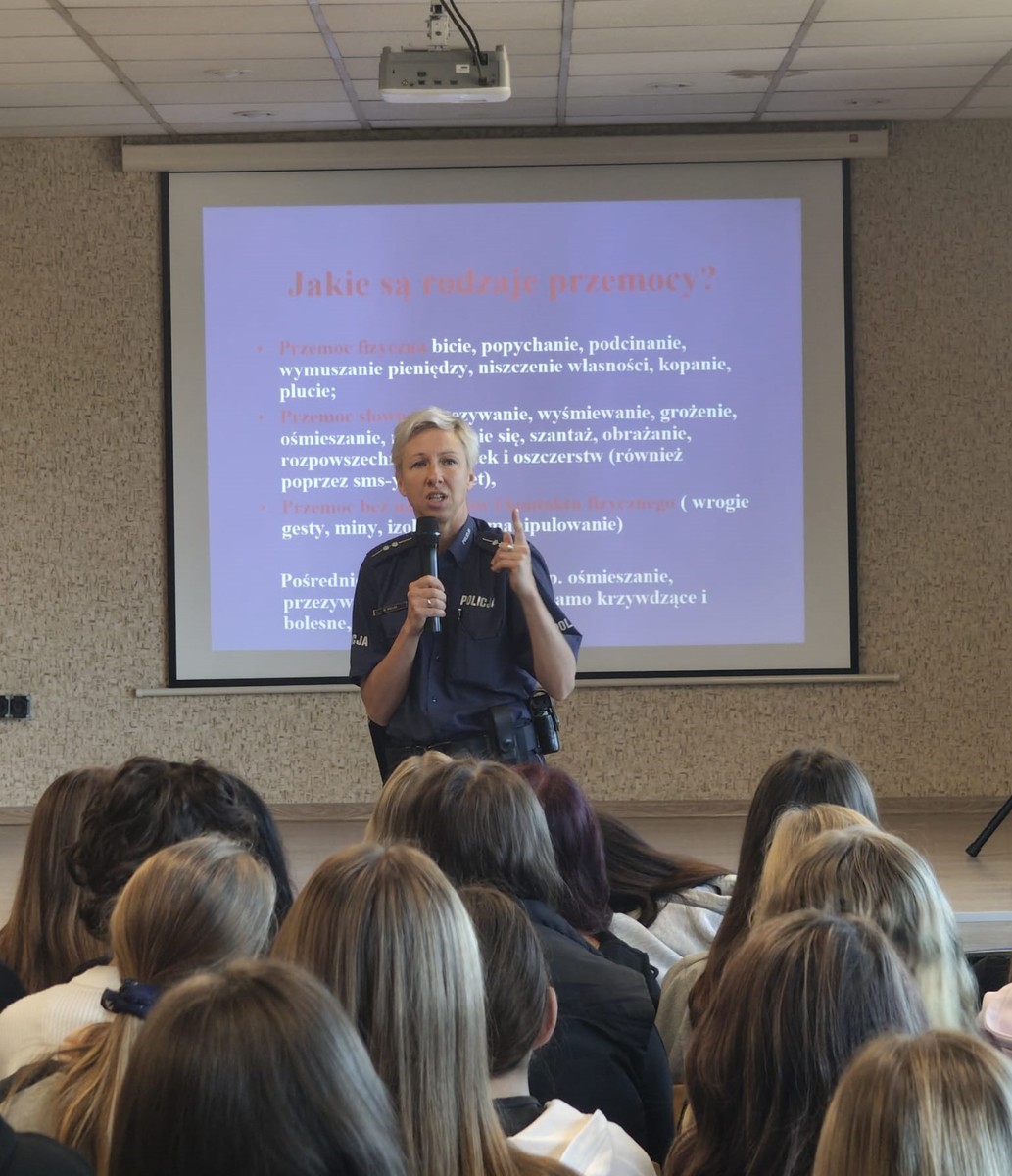 Podczas spotkania z policjantką młodzież miała okazję dowiedzieć się, czym jest przemoc rówieśnicza, jakie są jej formy i jakie mogą być jej konsekwencje dla sprawcy i ofiary. Funkcjonariuszka podkreślała, że brak reakcji na agresję wśród rówieśników może prowadzić do poważnych problemów wychowawczych i prawnych.