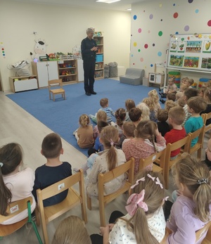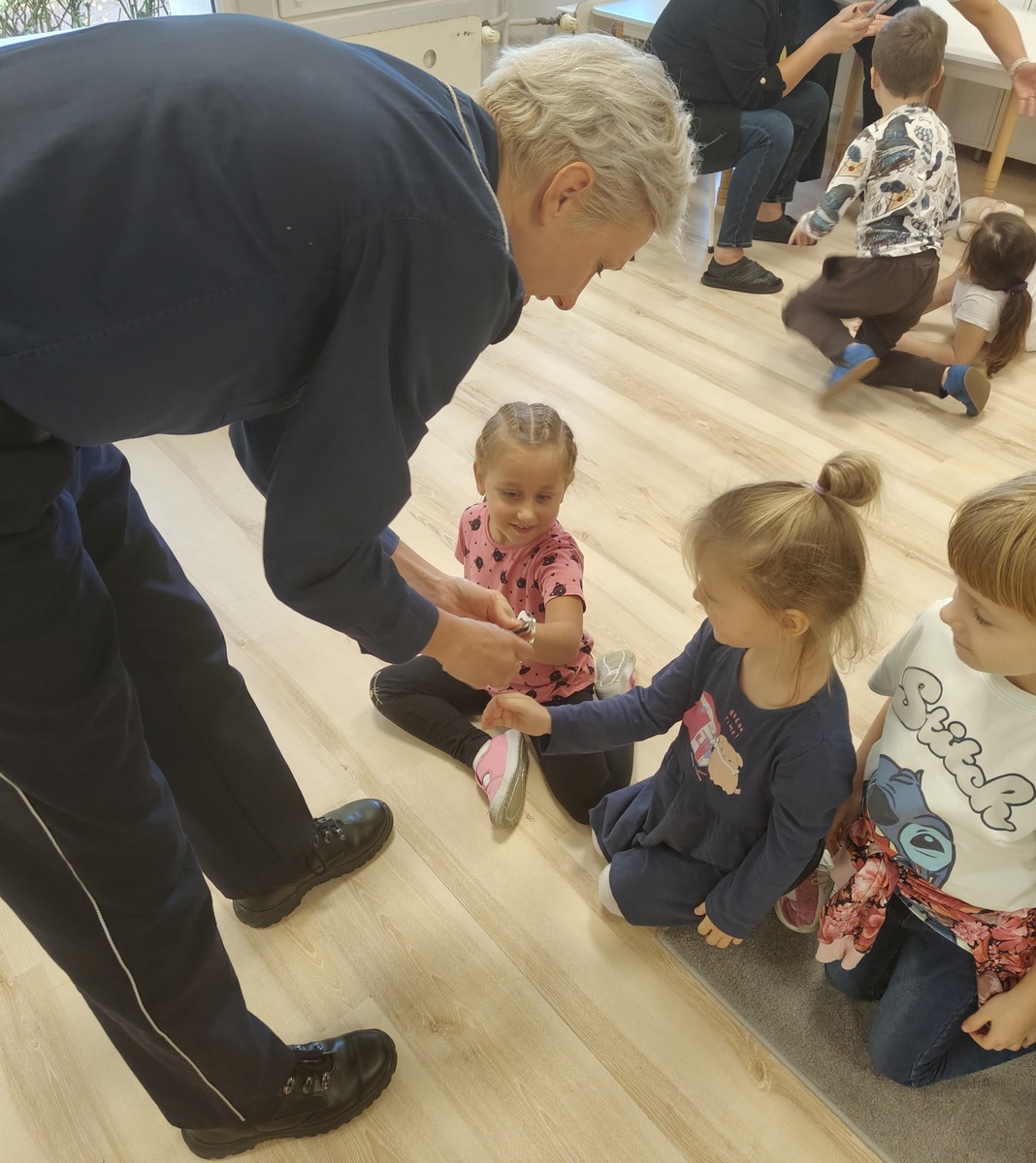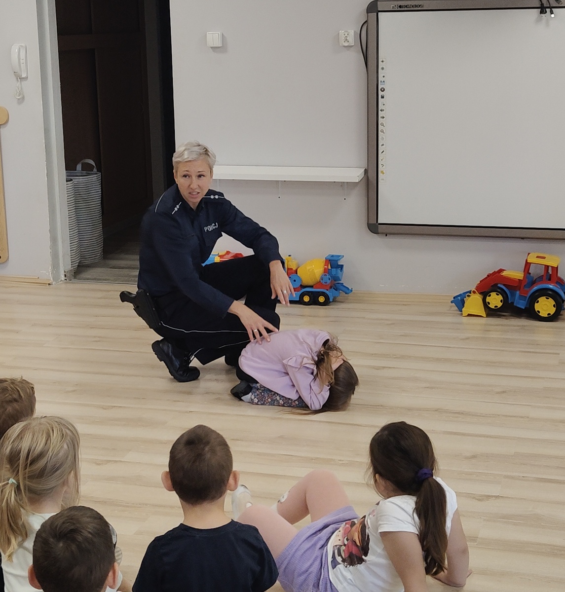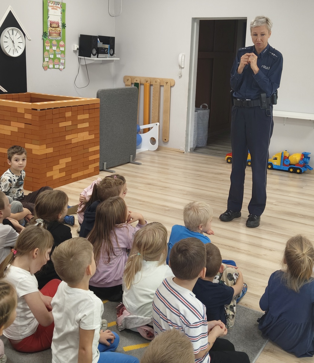 Policjantka podczas spotkania opowiedziała o swojej pracy i udzieliła dzieciom wskazówek co robić, gdy obcy puka do drzwi, częstuje słodyczami, proponuje przejażdżkę samochodem.