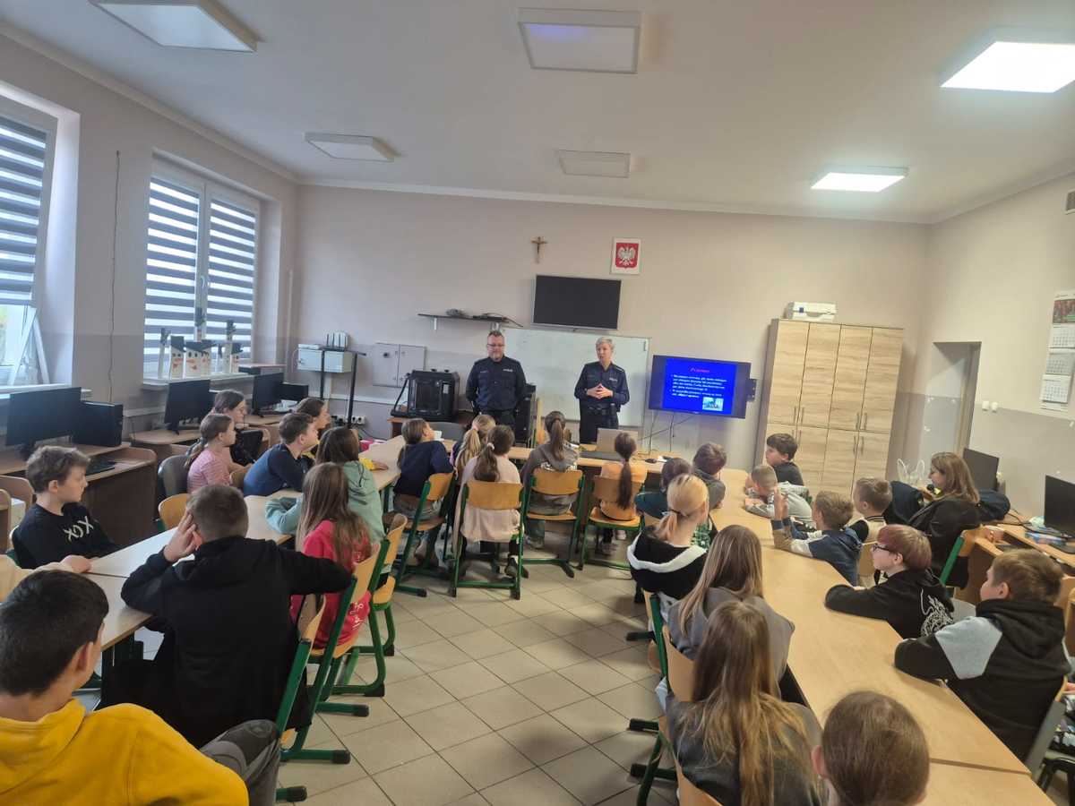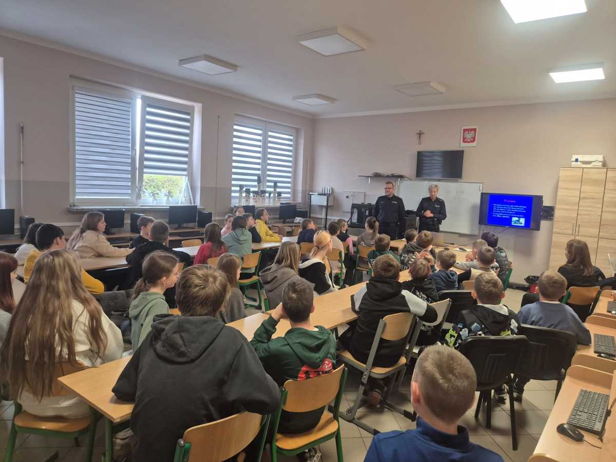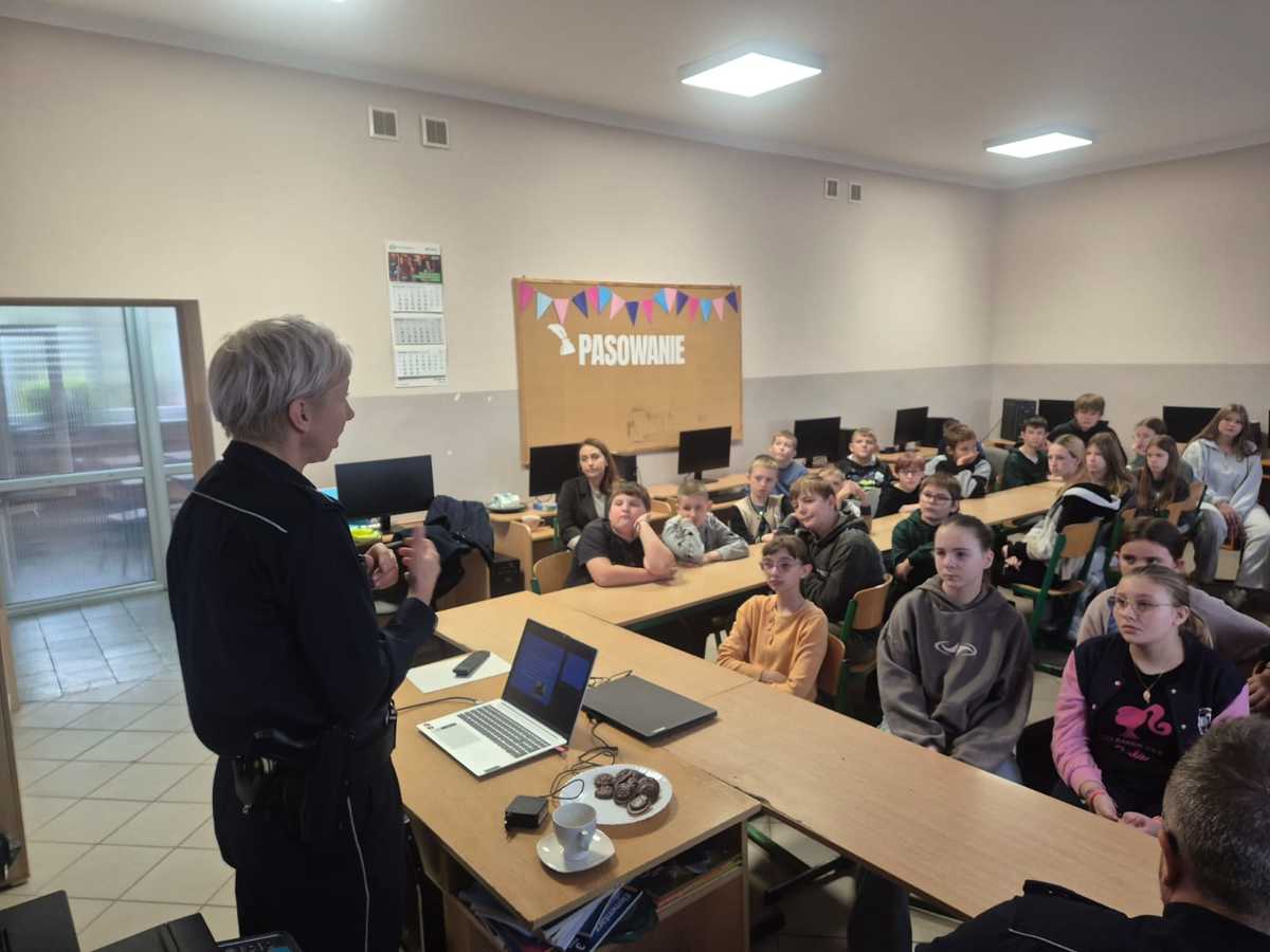 Policjantka prewencji i dzielnicowy z mogileńskiej komendy odwiedzili dzisiaj (05.11.2025) uczniów klas 4-8 Niepublicznej Szkoły Podstawowej w Parlinie. Spotkanie odbyło się w ramach ogólnopolskiej kampanii Dzieciństwo bez Przemocy. Przedsięwzięcie koncentruje się na uwrażliwieniu społeczeństwa na problem krzywdzenia dzieci, jak również działań na rzecz ochrony dzieci przed krzywdzeniem.
