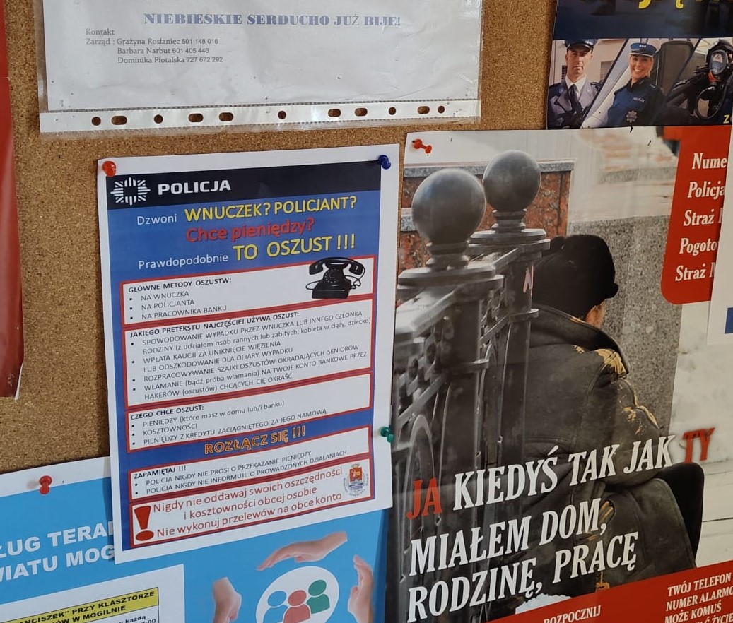 Plakaty ostrzegające seniorów przed oszustwami w miejscach użyteczności publicznej