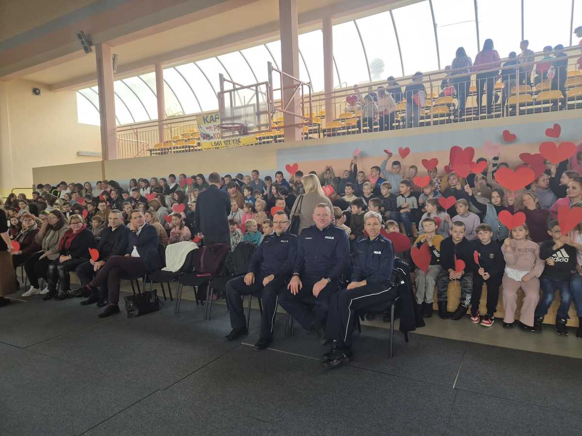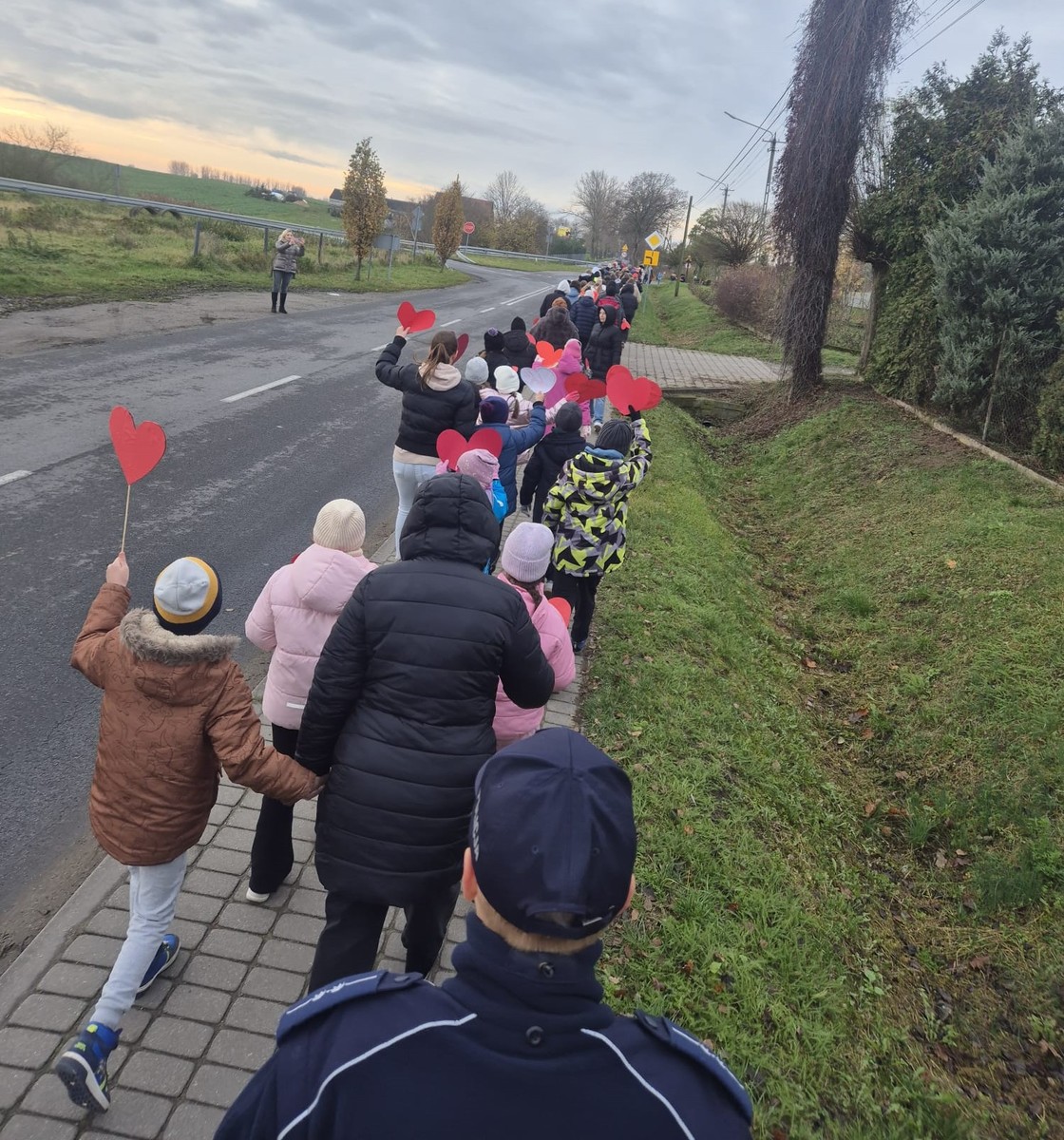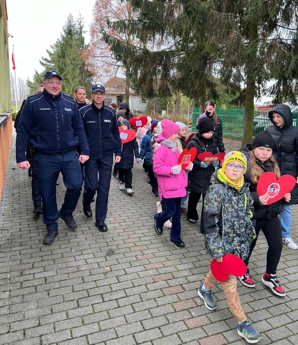 Wczoraj (19.11.2025) policjantka prewencji asp. Magdalena Pollak wspólnie z dzielnicowymi mł. asp. Dariuszem Banaszakiem i asp. Grzegorzem Batkowskim odwiedzili Zespół Szkół w Dąbrowie. Wizyta miała związek z organizacją w placówce obchodów ogólnopolskiej kampanii „Dzieciństwo bez przemocy”. Funkcjonariusze spotkali się z dziećmi i młodzieżą, informowali o zjawisku przemocy i przekazywali praktyczne wskazówki, gdzie szukać pomocy. Dzięki takim spotkaniom młodzi ludzie uczą się rozpoznawać zachowania nieakceptowalne, rozumieć swoje prawa i zwracać się po pomoc, gdy jest ona potrzebna. Tego dnia odbyło się rozstrzygnięcie konkursu plastycznego związanego z tematyką dzieciństwa bez przemocy i marsz uczniów i nauczycieli, będący wyrazem solidarności z ideą przeciwdziałania przemocy wobec dzieci i młodzieży. Ponadto o godzinie 17:00 przy budynku mogileńskiej komendy stanęli Burmistrz Mogilna Karol Nawrot, jego Zastępca Marcin Łączny, pracownicy MGOPS w Mogilnie oraz dzieci z Ogniska Wychowawczego, aby podświetlić komendę na czerwono, w geście sprzeciwu wobec krzywdzenia najmłodszych.