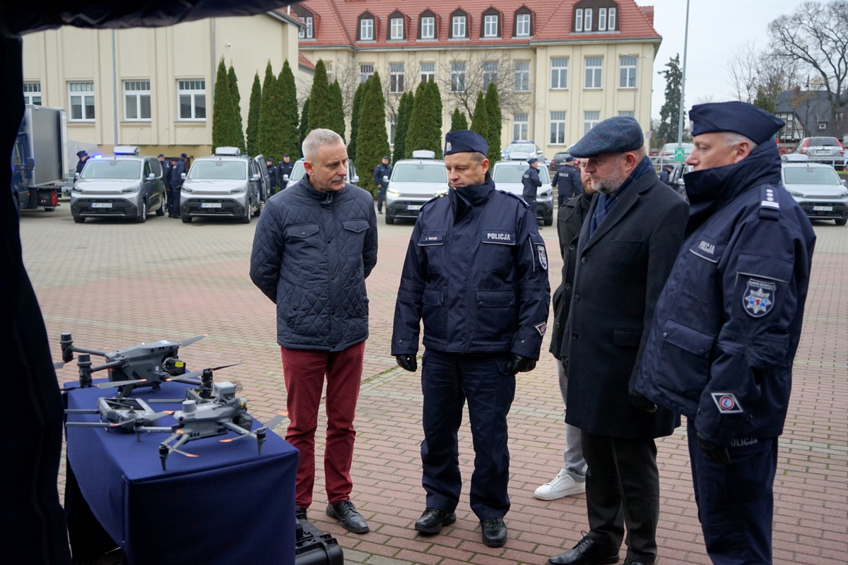 Nowe policyjne auta oraz bezzałogowe statki powietrzne – drony, to sprzęt o wartości 4 285 tys. złotych, którego zakup sfinansowano dzięki wsparciu  z programu „Fundusze Europejskie dla Kujaw i Pomorza 2021-2027” w kwocie 2 785 tys. złotych.