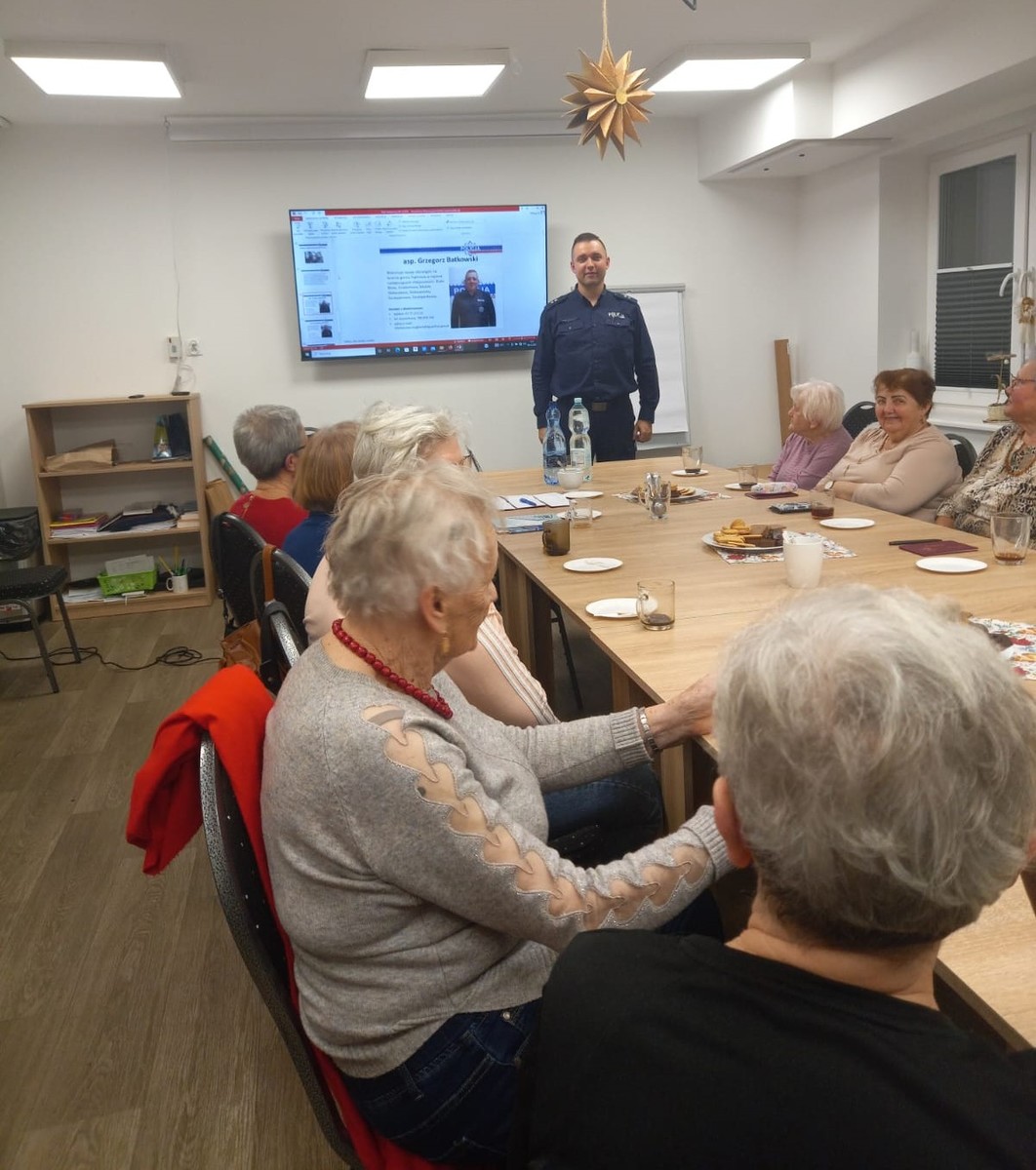 Spotkanie profilaktyczne odbyło się wczoraj (09.12.2025) w Domu Seniora w Dąbrowie. Głównym celem było uwrażliwienie seniorów na sytuacje, w których mogą stać się ofiarą przestępstwa i przekazanie im informacji jak powinni postępować w przypadku zagrożenia.