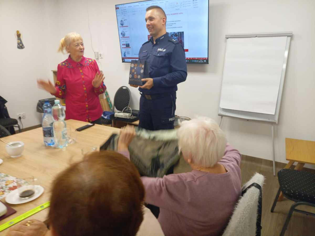 Nie zabrakło również informacji na temat problematyki bezpieczeństwa osób starszych jako uczestników ruchu drogowego. Funkcjonariusz przypomniał o obowiązku używania elementów odblaskowych po zmierzchu oraz o podstawowych zasadach poruszania się pieszych i rowerzystów po drogach.