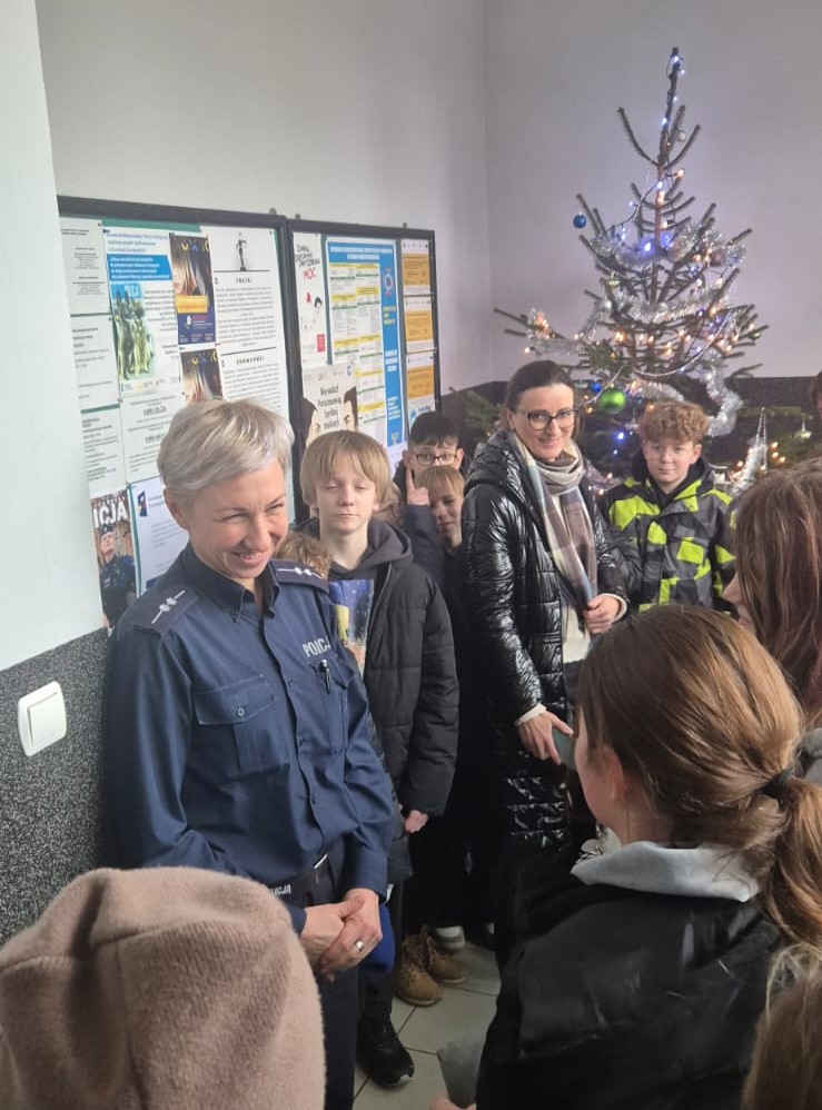 Zazwyczaj to policjanci spotykają się z dziećmi w szkołach, jednak tym razem to uczniowie odwiedzili stróżów prawa w ich siedzibie. Wczoraj (17.12.2025) dzieci z miejscowej podstawówki złożyły Komendantowi Powiatowemu Policji w Mogilnie kom. Pawłowi Kazubowskiemu wigilijne życzenia dla wszystkich funkcjonariuszy i pracowników cywilnych. Uczniowie wręczyli również przygotowany przez siebie świąteczny stroik. Korzystając z okazji, policyjny profilaktyk asp. Magdalena Pollak udzieliła kilku porad na temat bezpiecznych form spędzania czasu wolnego.