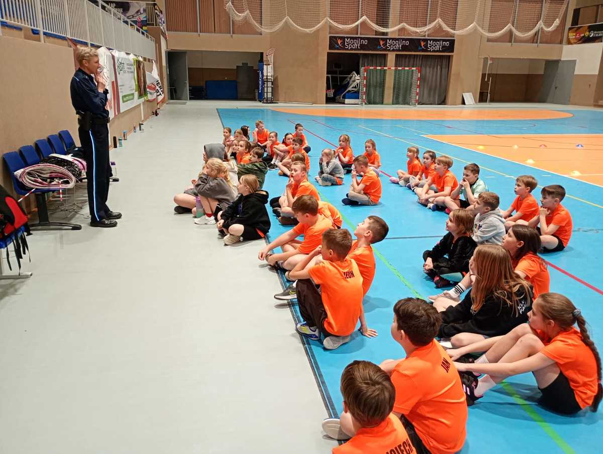 Policjanci z Komendy Powiatowej Policji w Mogilnie w ramach prowadzonych działań „Bezpieczne ferie” spotykają się z uczestnikami półkolonii organizowanych na terenie miasta. Tym razem prelekcji o bezpieczeństwie podczas zimowego wypoczynku oraz podstawowych zasadach ruchu drogowego, wysłuchali uczestnicy zajęć odbywających się na mogileńskiej hali sportowej.