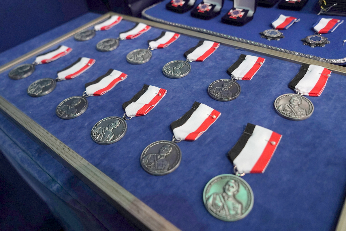 • ujęcie na mundur i przypięte medale oraz niebieska wstążkę