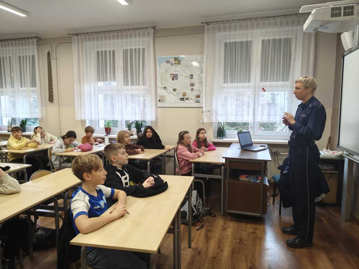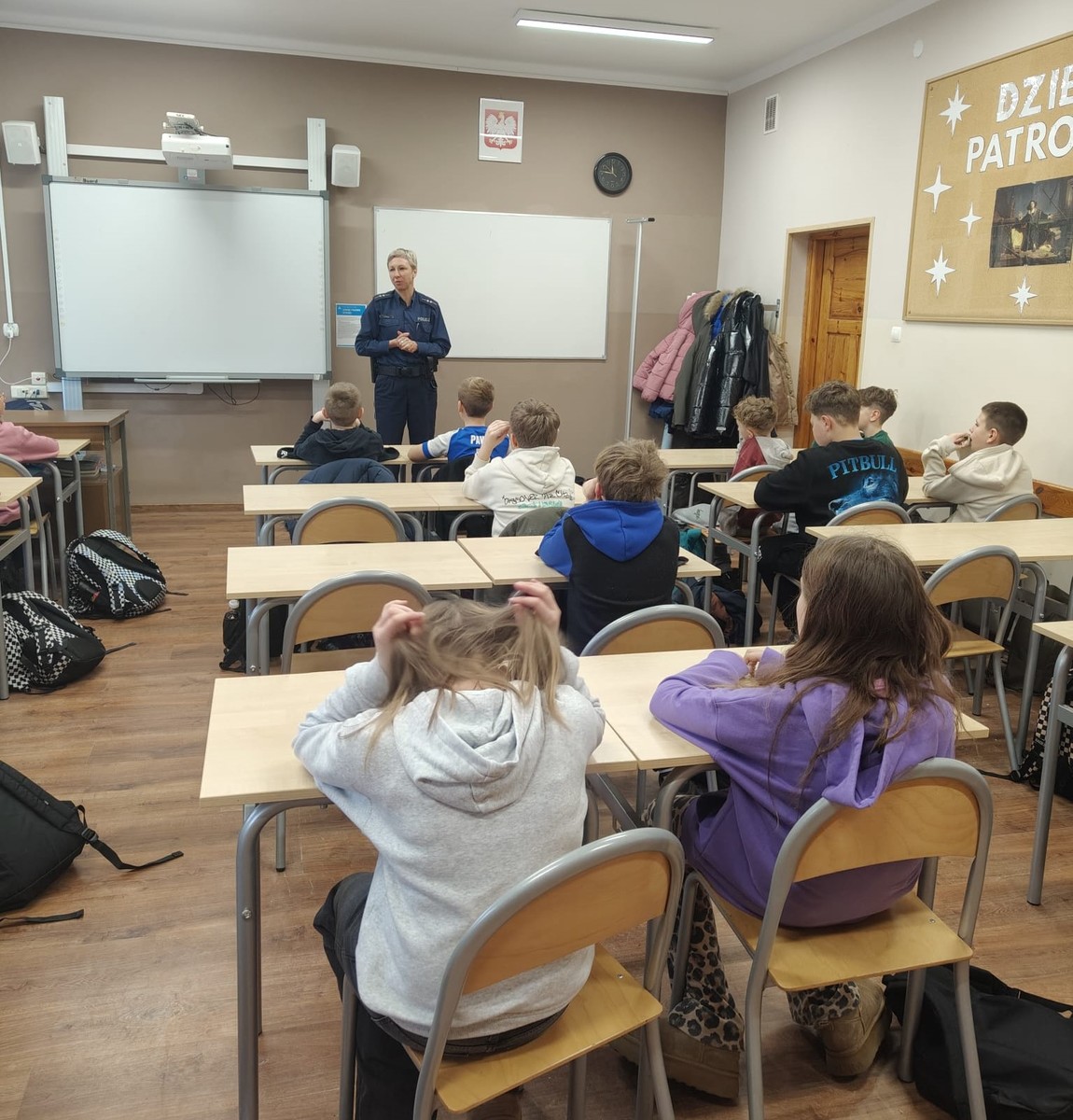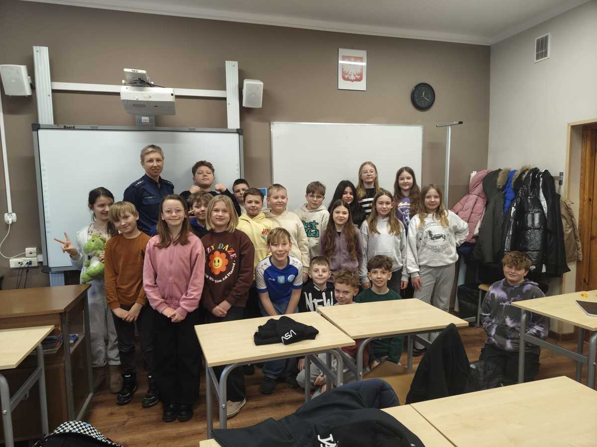 Uczniowie poznali zasady bezpiecznego korzystania z Internetu. Policjantka omówiła korzyści jak i zagrożenia płynące z użytkowania komputera i dostępu do sieci Internet. Zwróciła również uwagę na konsekwencje wynikające z popełniania czynów zabronionych z użyciem urządzeń służących do komunikacji elektronicznej.