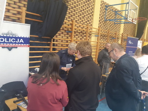 Mundurowi odpowiadali na liczne pytania dotyczące kryteriów doboru, warunków jakie musi spełnić kandydat, który chce zostać policjantem, a także wręczali ulotki z niezbędnymi informacjami dotyczącymi postępowania kwalifikacyjnego.