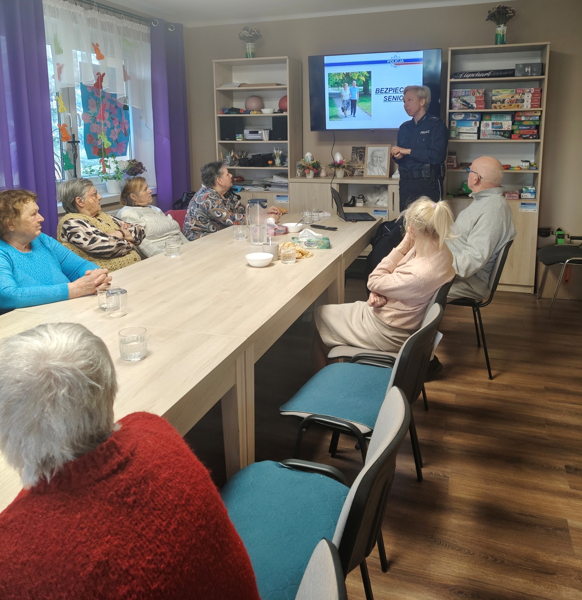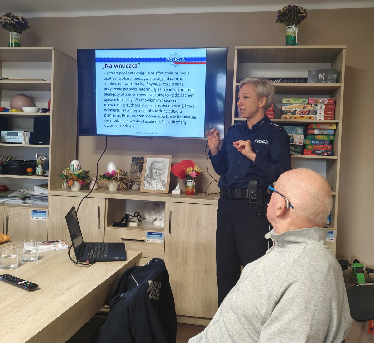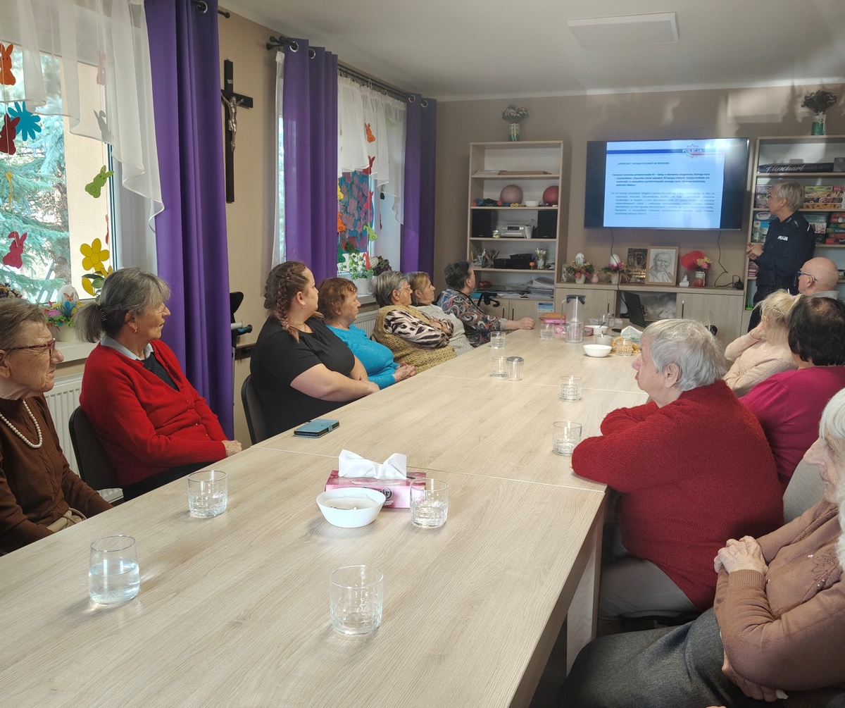 Spotkanie profilaktyczne odbyło się wczoraj (15.04.2026) w Dziennym Domu Pomocy „Witalność” we Wszedniu. Głównym celem było uwrażliwienie seniorów na sytuacje, w których mogą stać się ofiarą przestępstwa i przekazanie im informacji jak powinni postępować w przypadku zagrożenia.
