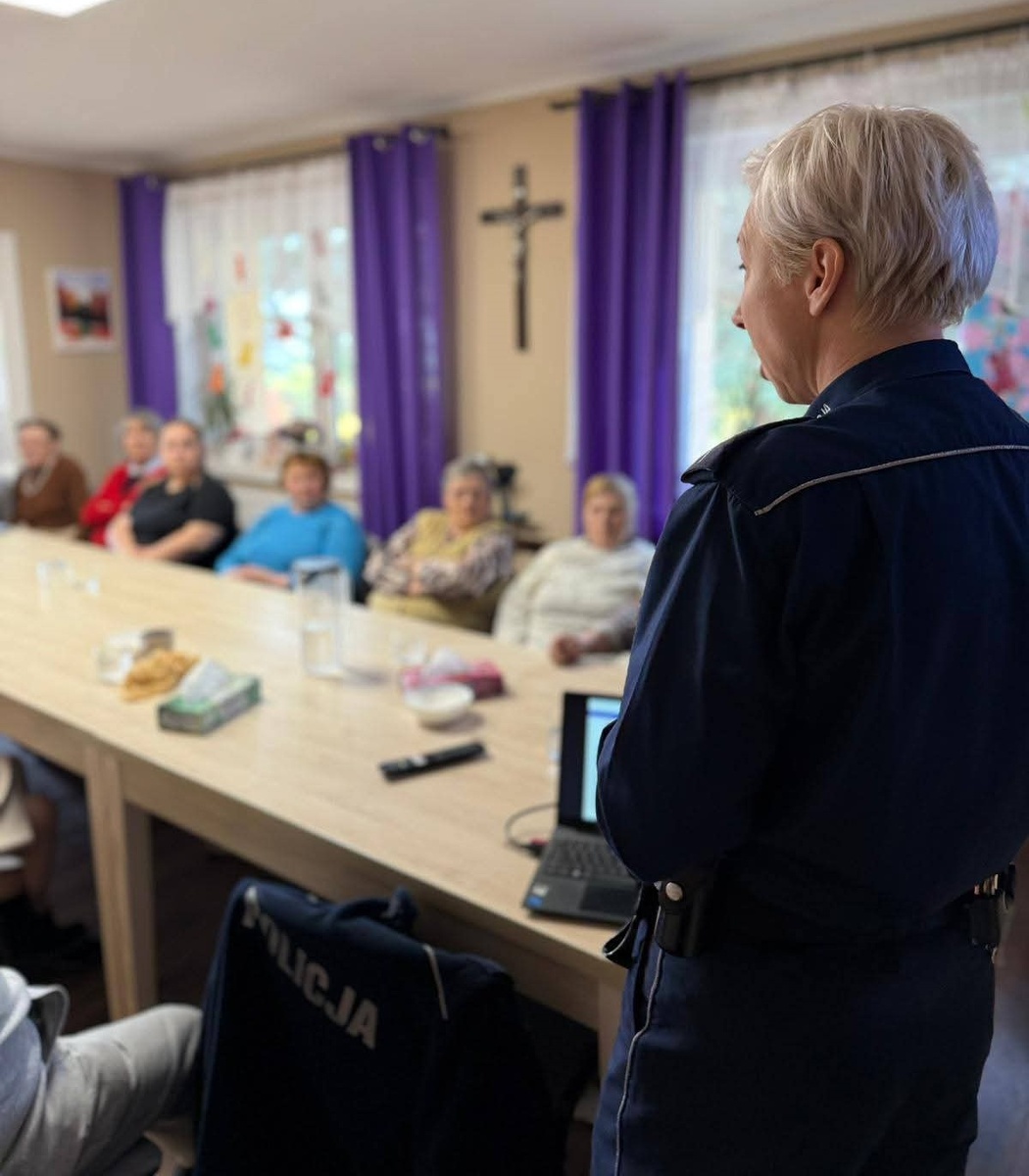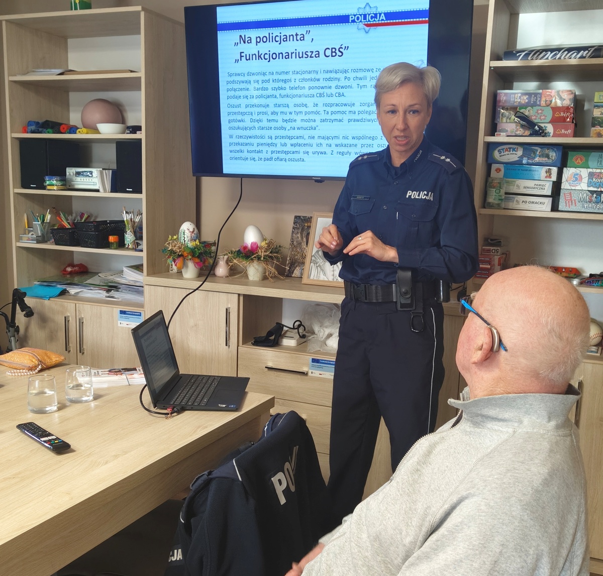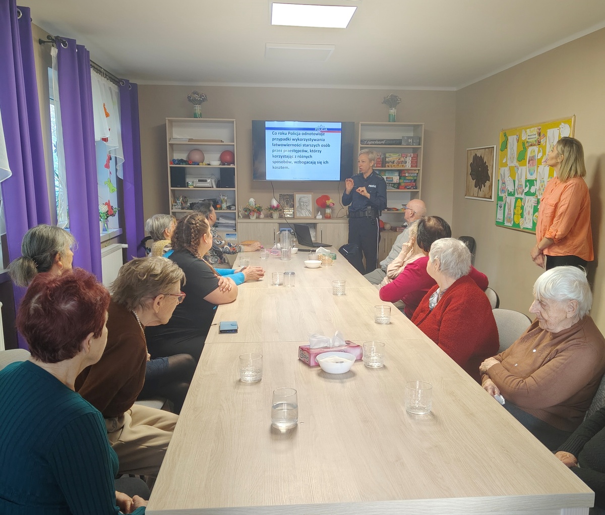 Spotkanie profilaktyczne odbyło się wczoraj (15.04.2026) w Dziennym Domu Pomocy „Witalność” we Wszedniu. Głównym celem było uwrażliwienie seniorów na sytuacje, w których mogą stać się ofiarą przestępstwa i przekazanie im informacji jak powinni postępować w przypadku zagrożenia.