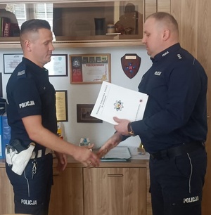 Wczoraj (22.04.2026) Komendant Powiatowy Policji w Mogilnie kom. Paweł Kazubowski w obecności Naczelnika Wydział Ruchu Drogowego w Mogilnie asp. szt. Mariusza wręczył funkcjonariuszowi rozkaz personalny o awansie na stopień młodszego aspiranta Policji. Szef mogileńskiej jednostki w kilku słowach skierowanych do mł. asp. Łukasza Dolaty pogratulował ukończenia kursu aspiranckiego i życzył mu dalszych sukcesów.